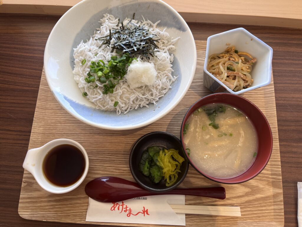 明浜町の特産品のひとつである釜あげしらすがたっぷりご飯にのっており、味噌汁や漬物、小鉢までついてボリューム満点です。