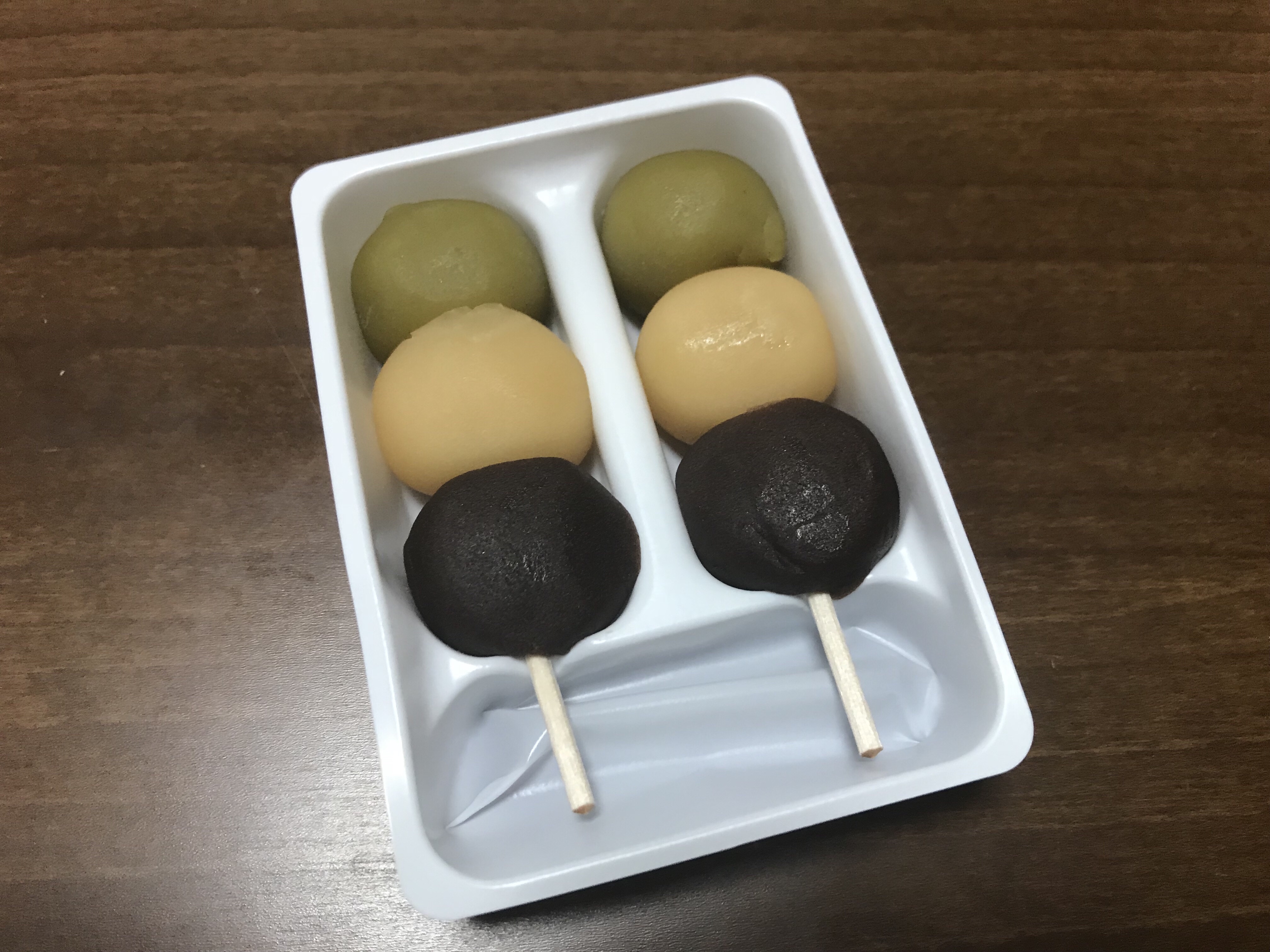 色が違う団子はそれぞれ、緑が抹茶餡、黄色が卵餡、黒が小豆餡になってます。