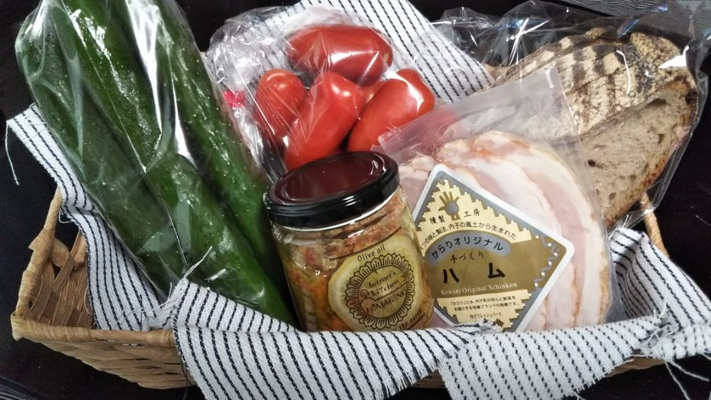 ○食材の購入店:野菜のオリーブオイル漬、ハム、きゅうり、トマト