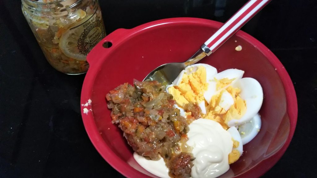野菜のオリーブオイル漬にゆで卵とマヨネーズを混ぜて・・・タルタルソースの出来上がり!