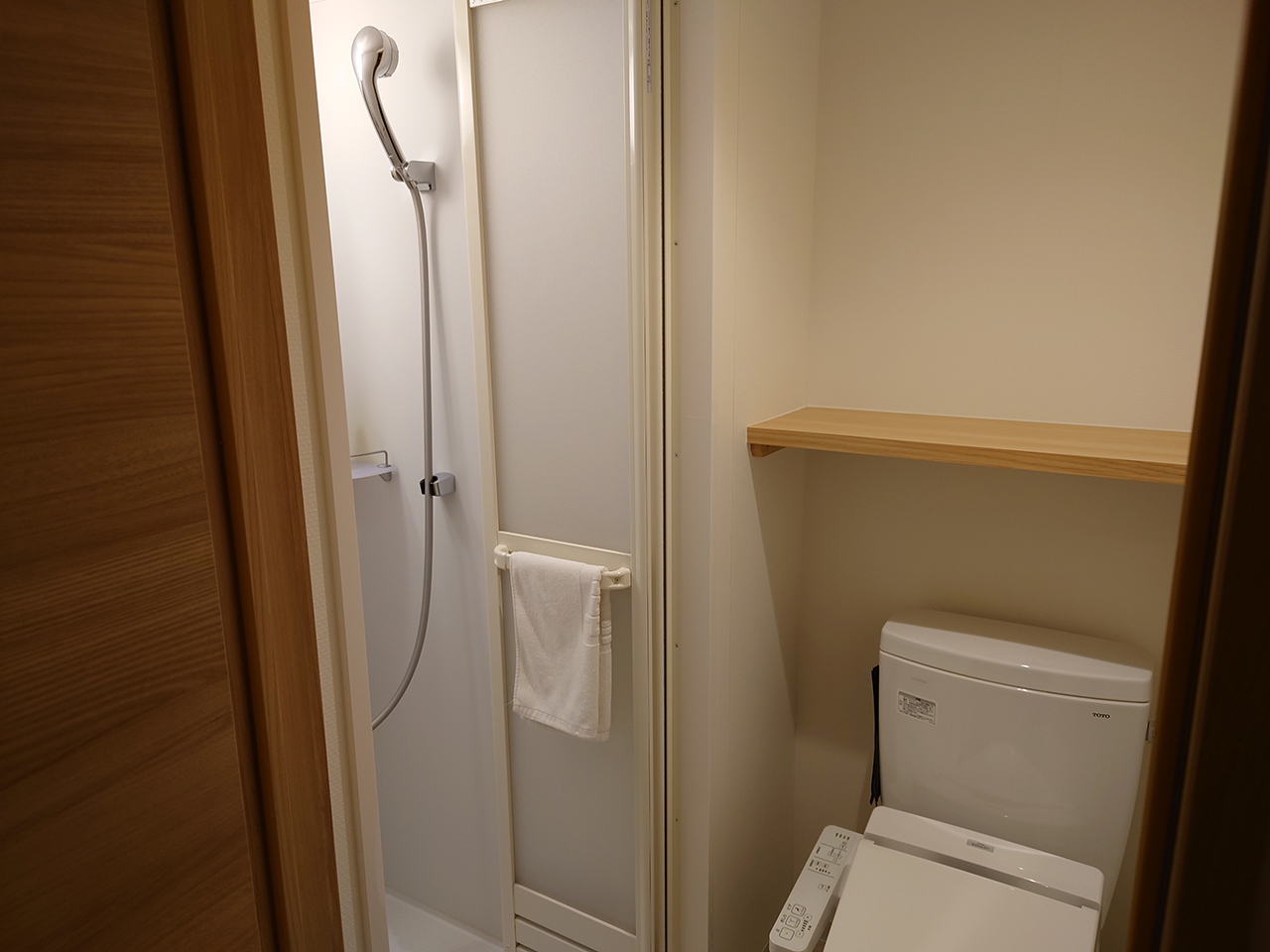 お部屋の構成はベッドとデスク、シャワーブースとお手洗いとシンプルにまとまっています。