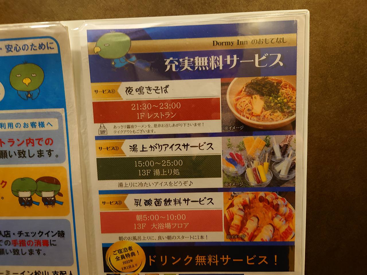 また、写真はありませんが、「ドーミーイン」はドライサウナが100度近くで、松山では強冷水(12度前後)の水風呂も用意されているという、サウナ好きも満足の環境です。