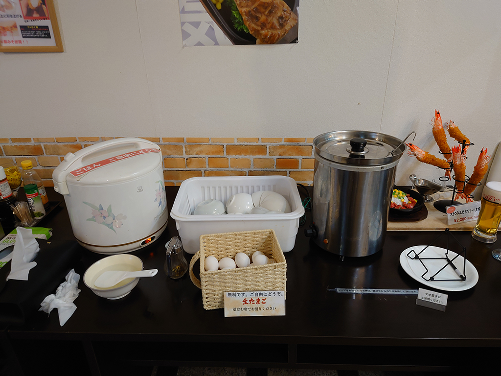 ノドも潤ったところで肉の到着に備えてセルフのご飯と玉子、スープを準備します。