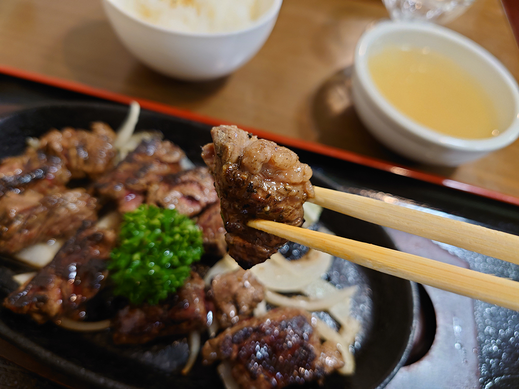 サイコロステーキはお店によっては食べ応えのある肉々しい赤みが出てくることもありますが、こちらは柔らかく食べられるし、肉!な感じはありますがサシもそれなりにあって食べやすいです。