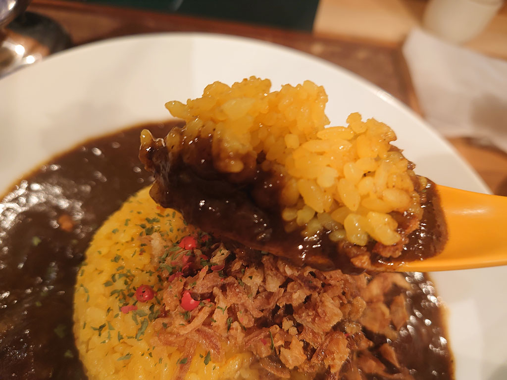 真ん中から少しずらしてサフランライスの山とそこにかかるフライドオニオン。