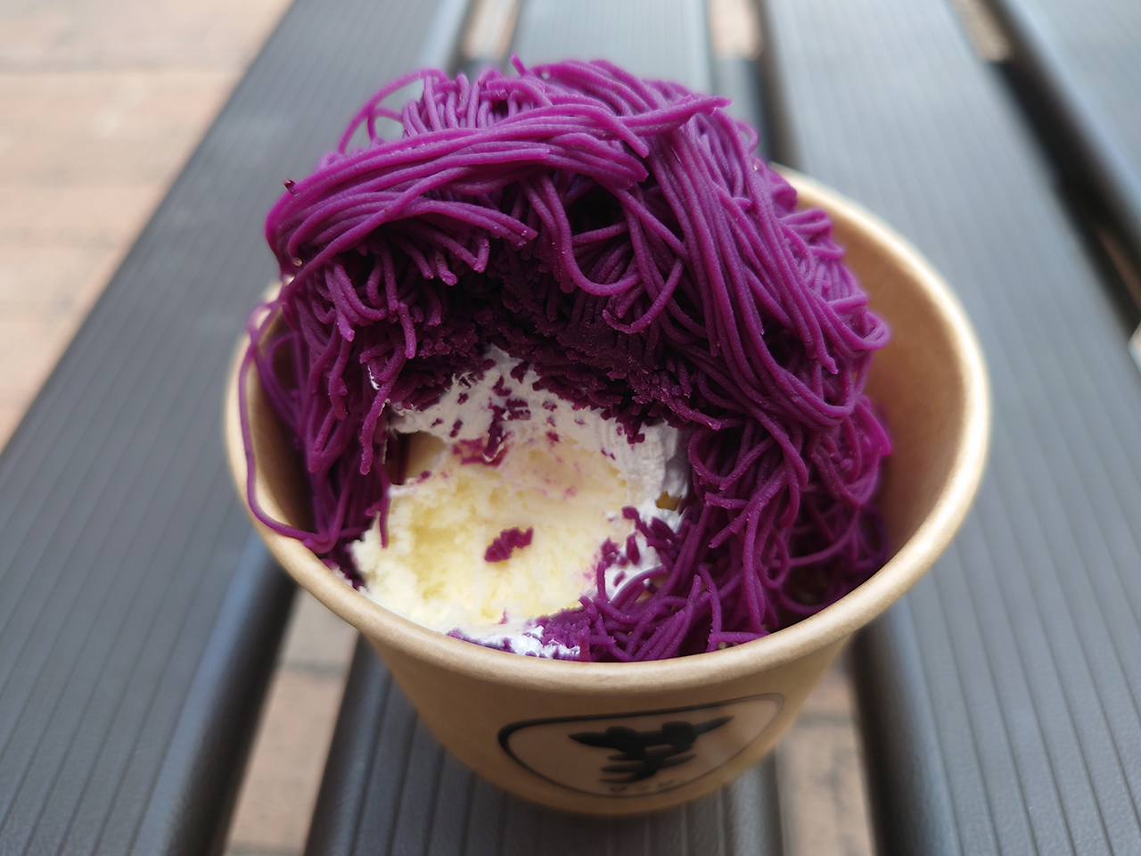 勘違いしがちですが、この紫の部分は芋であってアイスではないので冷たくはないです。