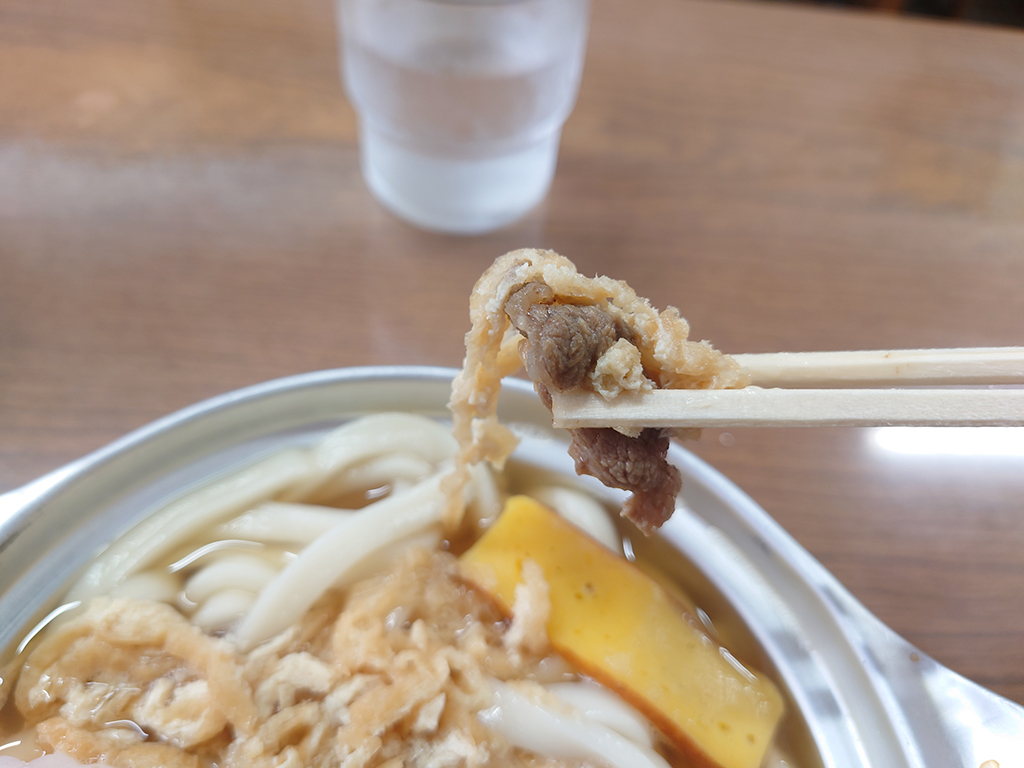 結構そこが深いのでそれなりの量のうどん麺に油揚げと甘く煮たお肉などがトッピングされています。
