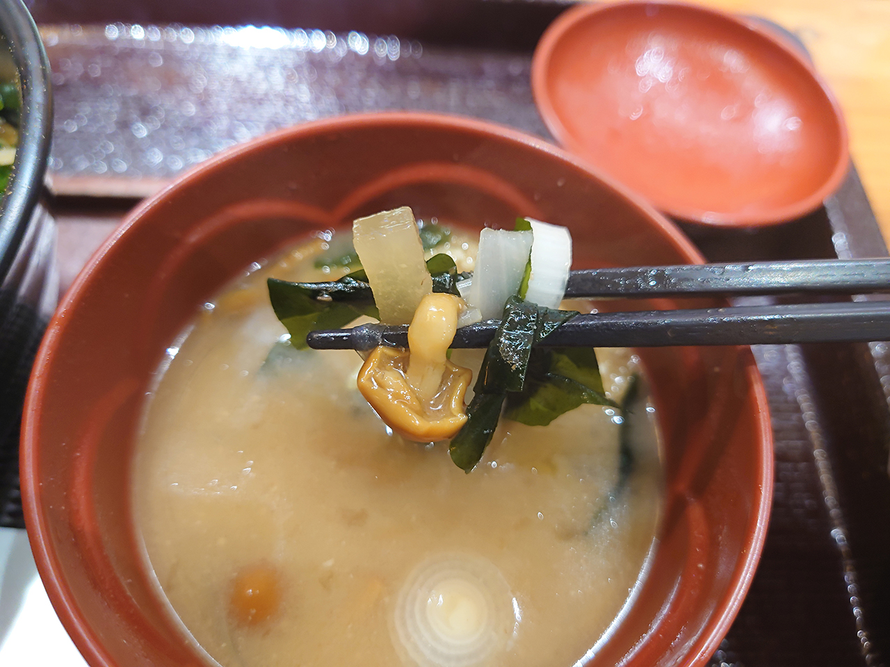 お味噌汁はなめこに大根、わかめとネギの具たっぷり。