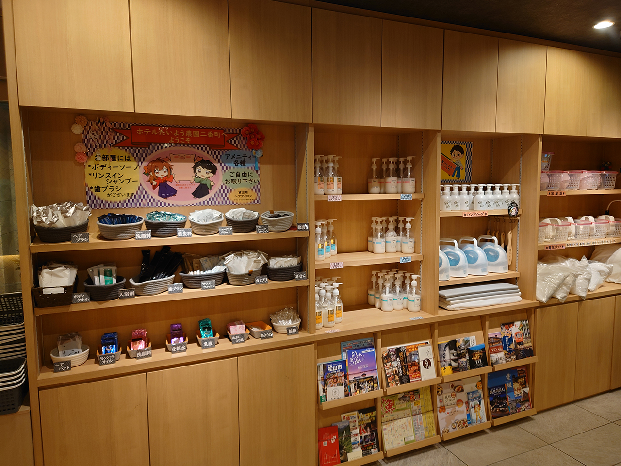 フロントには貸し出しのアメニティが多数取りそろえられています。