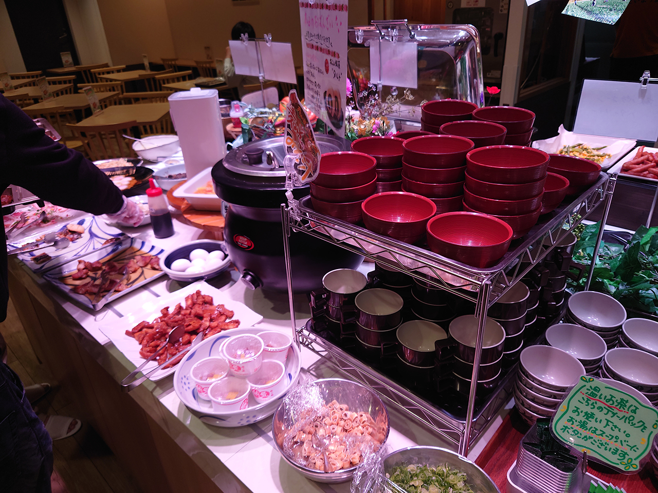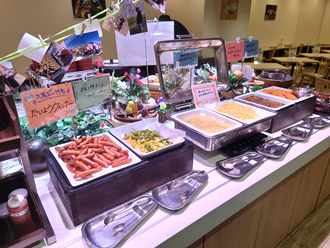 おかずではこちらも関連会社の畜産会社特製のウインナー(めっちゃ美味い)をはじめ、ビジネスホテルの朝食バイキングでは珍しい揚げ物や肉類も充実。