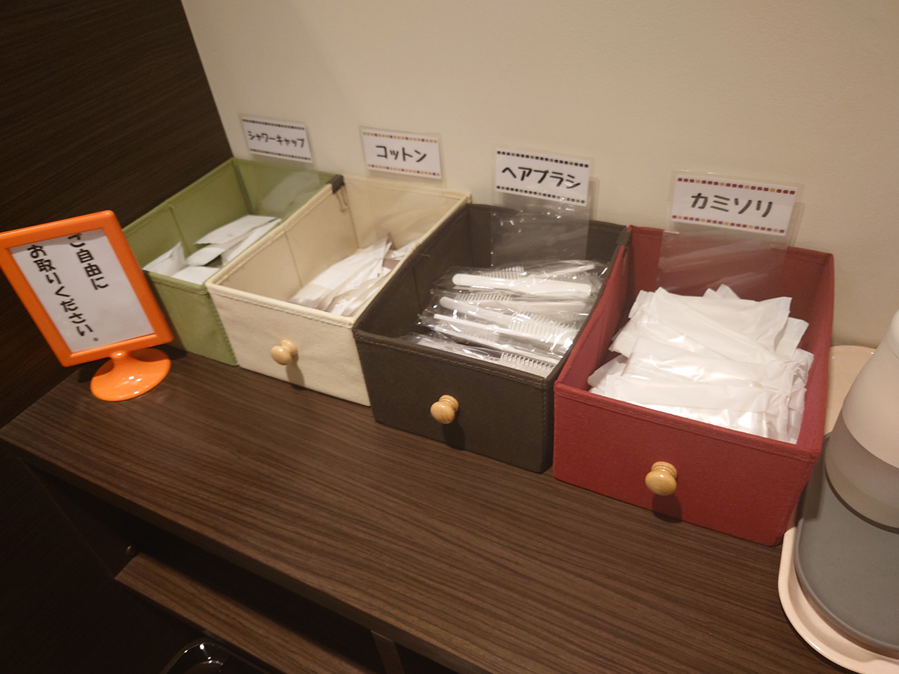 2階のフロントでチェックインをしたら、歯ブラシ以外はフロントの近くにあるところから持って行きます。