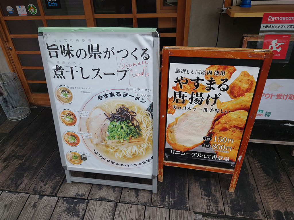 やすまるの店頭には「旨味の県が作る煮干しスープ」とあります。