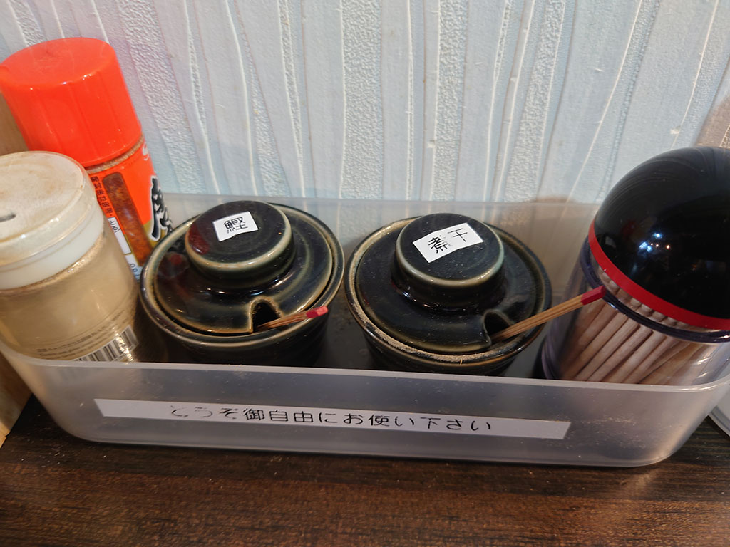 着席すると目の前には「鰹」「煮干」の文字が書かれた瓶がありました。
