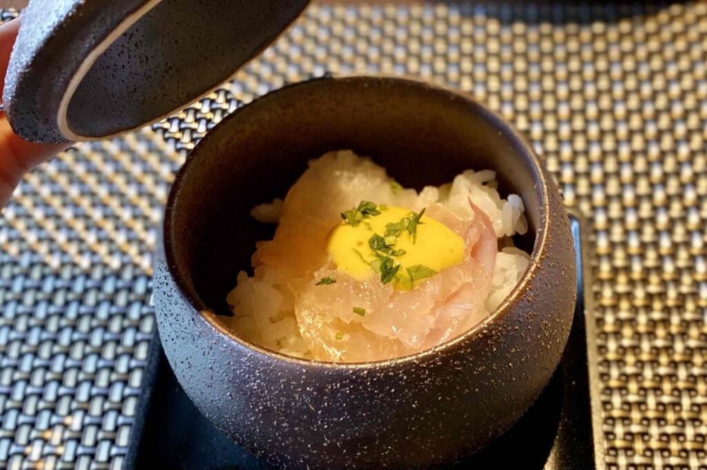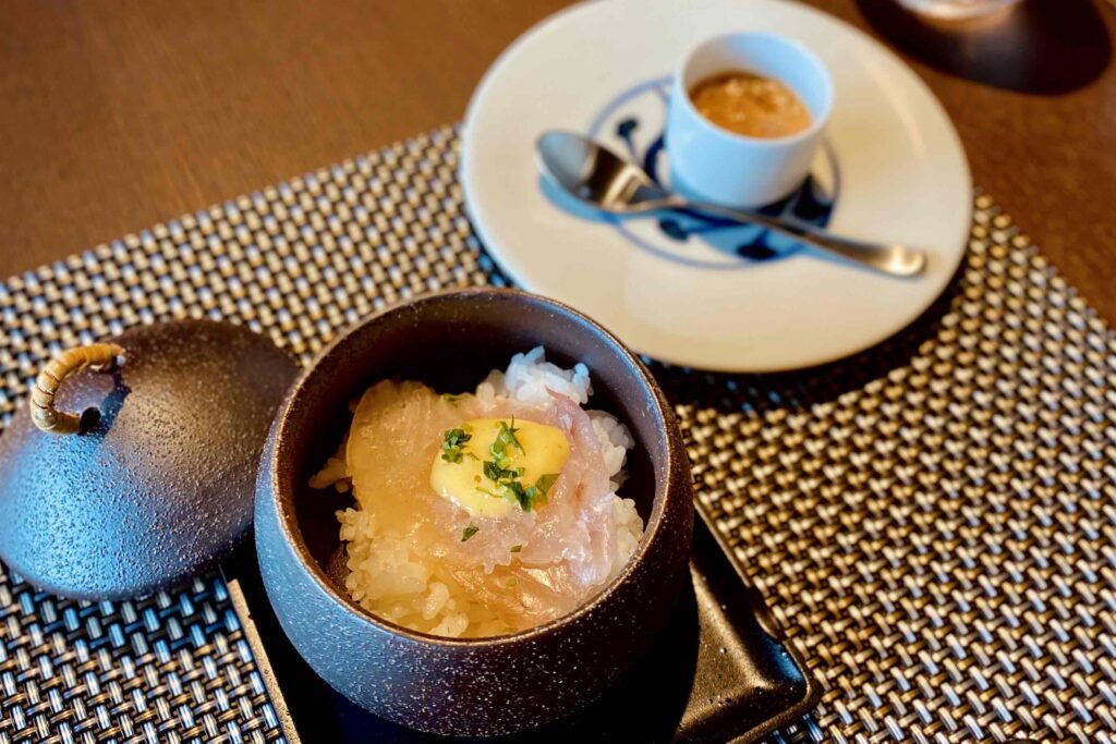 写真右上、ぱっと見カプチーノに見えるのはこの鯛飯にかけるお醤油。