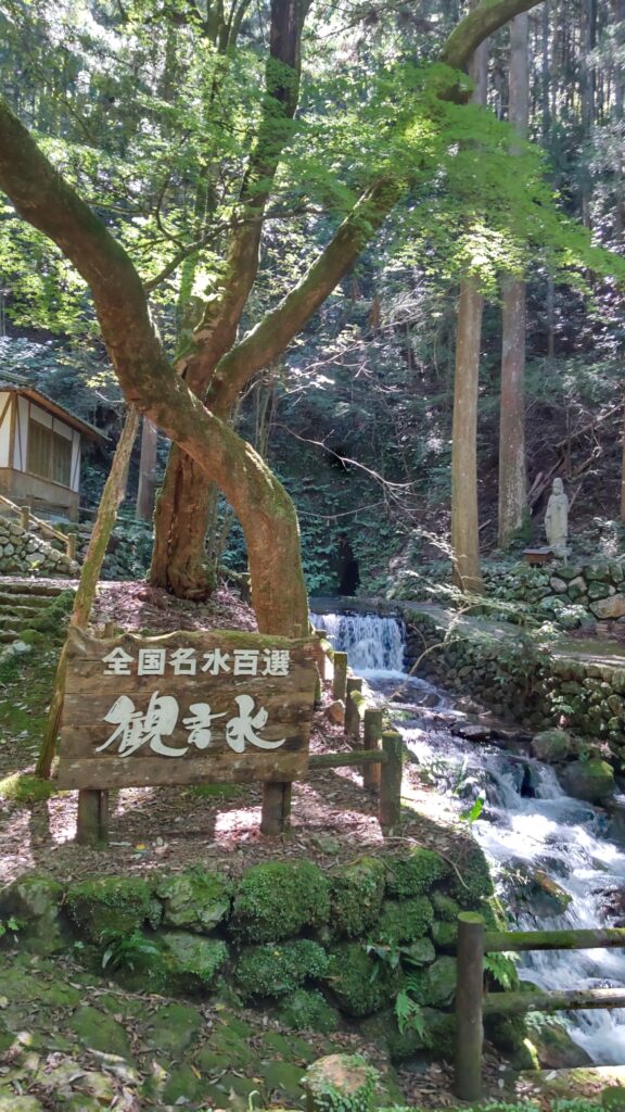 説明書きによると、観音水は全国名水100選にも選ばれている名水で、日量8000トンの清水が湧き出し、水温は年間を通して14度に保たれているそうです。観音水の水源は標高312mの鍾乳洞にあり、ミネラルが多く含まれ、硬度が高い弱アルカリ性の体に良い水なんだとか。