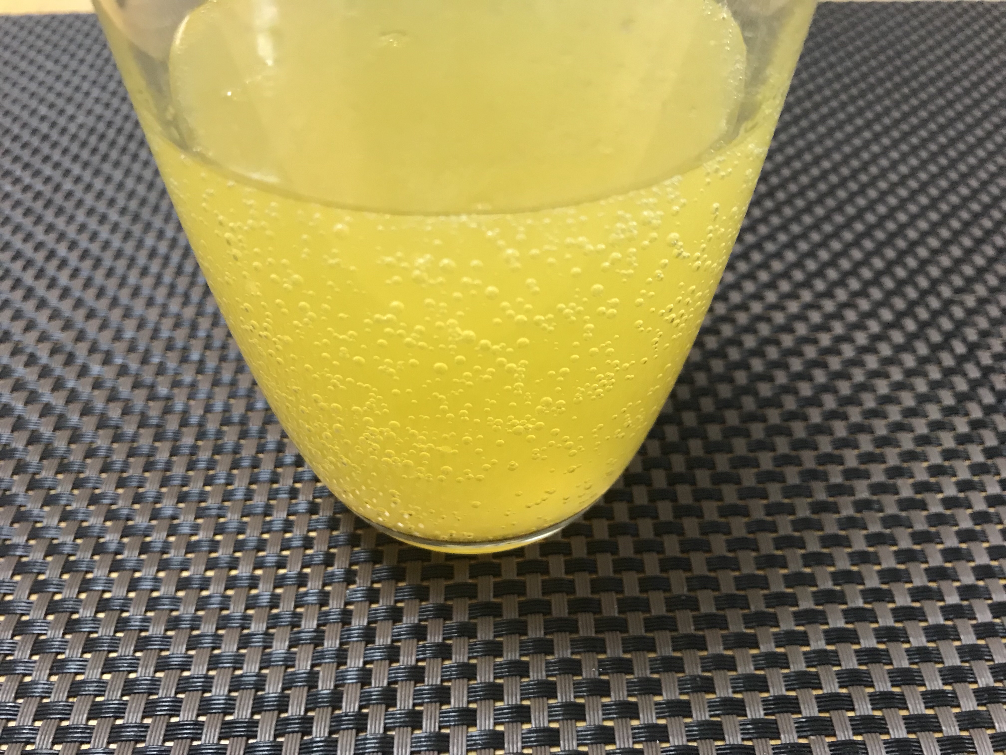 グラスに入れたらこんな感じ。炭酸が良い感じですね。味わいはレモンの酸味をミカンの優しい甘みで程よい飲み物にしています。