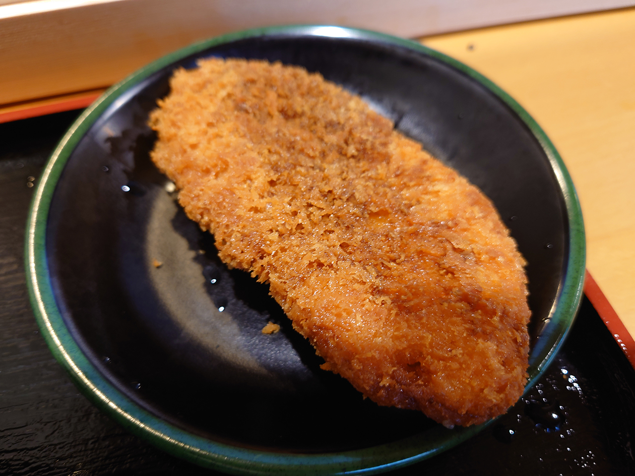 カウンターで無料トッピングの天かすやネギをいただき、揚げ物コーナーでチキンカツをいただきお会計。