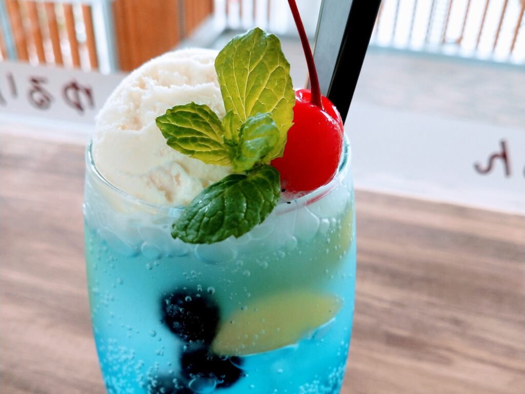 「スイーツ・カフェ nico」のクリームソーダは、味を自分で選択できるので、ブルーハワイに。