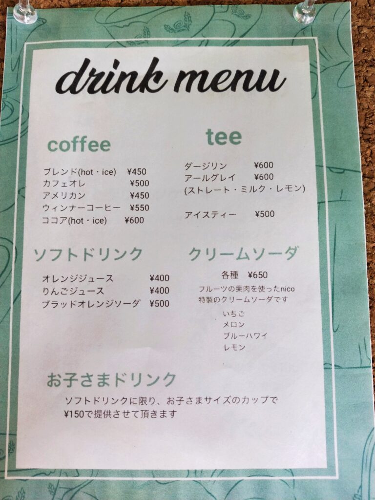 今回紹介させていただいた「スイーツ・カフェ nico」のメニューはこのようになっています!