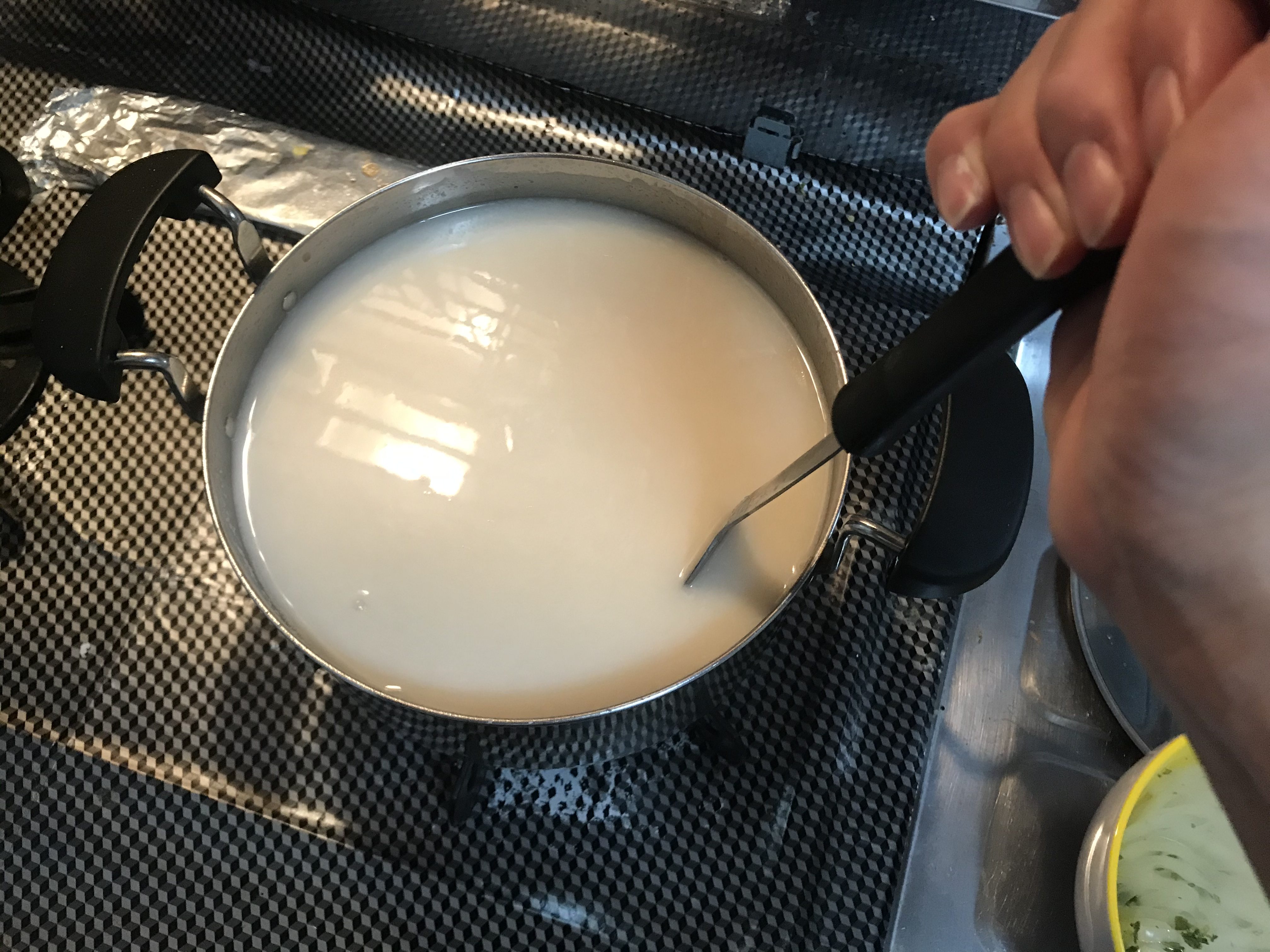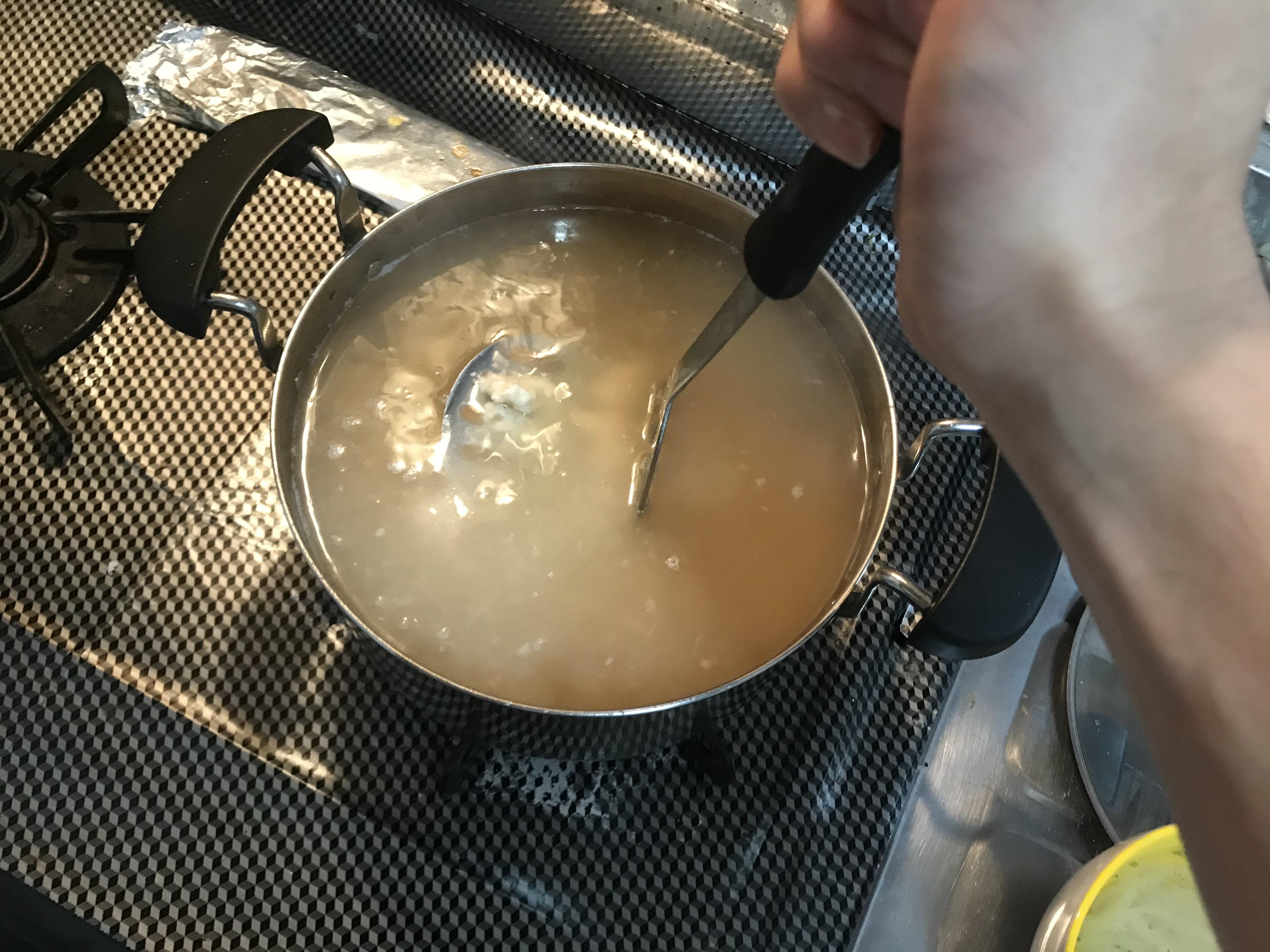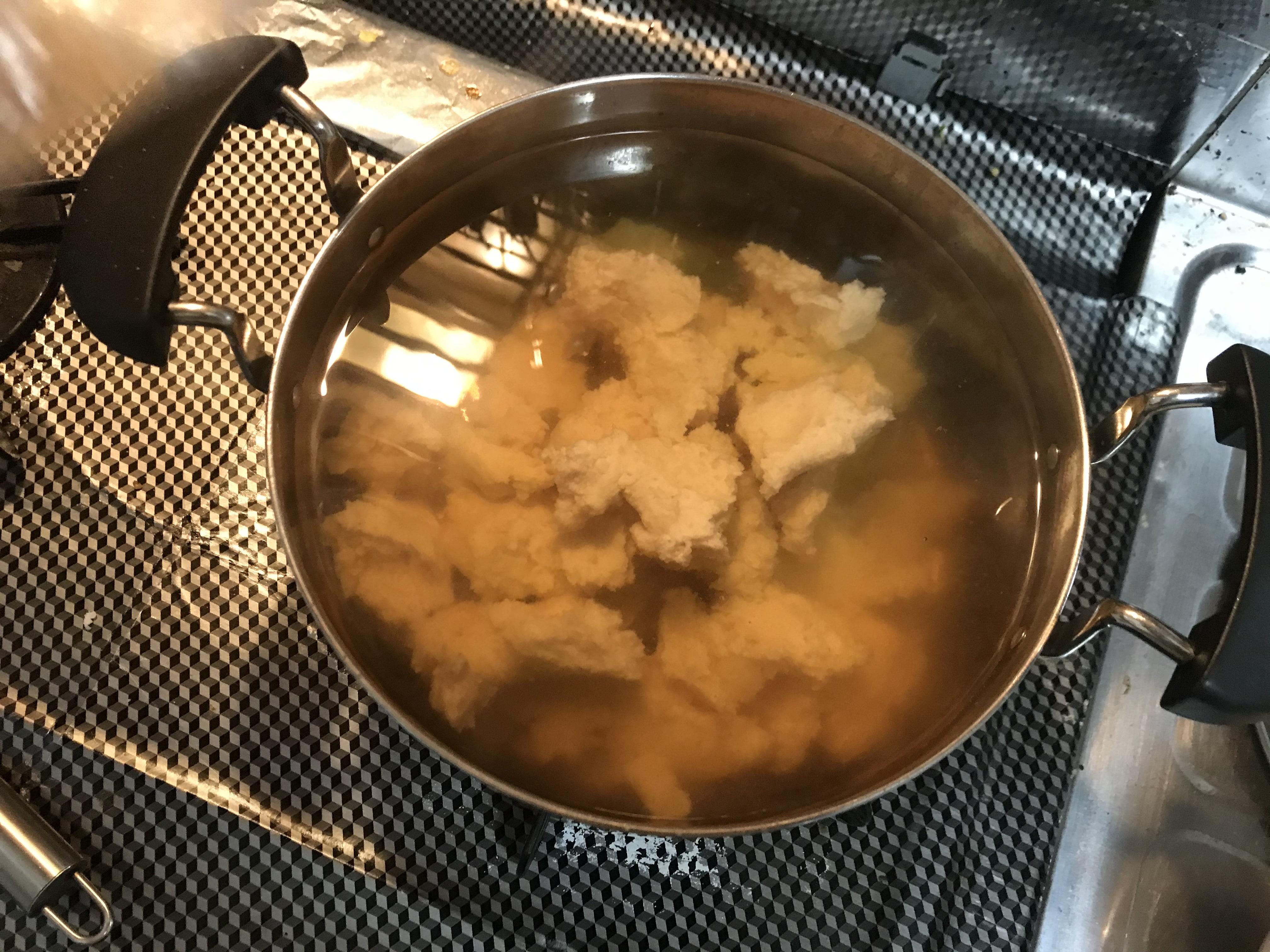 水が沸騰したら、火を止めて酒粕を細かくちぎって入れます。