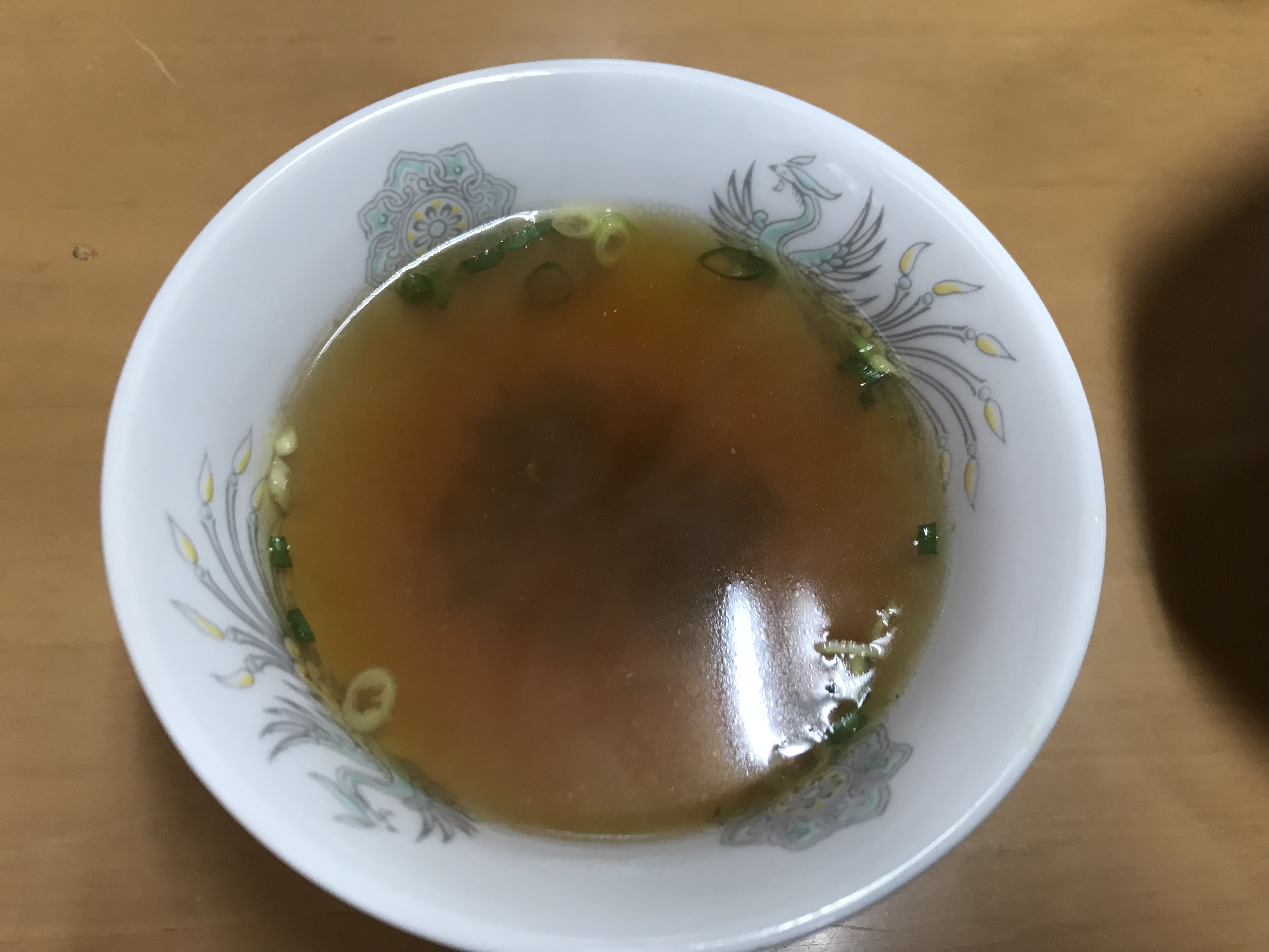 「ヤキメシ」を注文すると、中華スープもついてきます。このスープも味わい深くて美味しい。